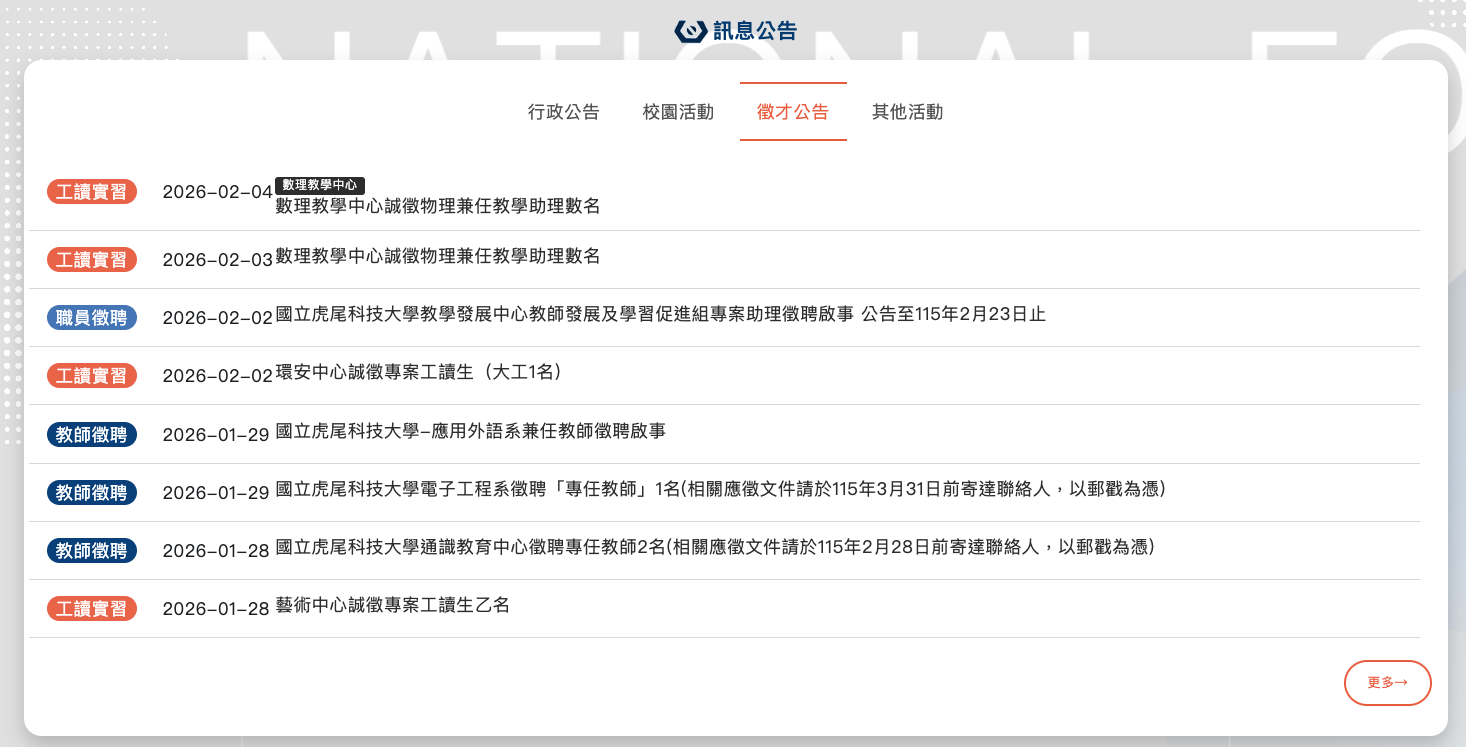 目前校首頁共開放「行政公告」、「校園活動(校內各項活動,需附上封面圖片)」、「其他活動(原學術及藝文,主要為校外訊息)」與原徵才公告現區分為三類:「教師徵聘」、「職員徵聘」及「工讀實習」